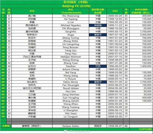 北京时间9月13日,德国转会市场亚洲区管理员朱艺 公布了北京国安参加亚冠二级联赛(小组赛阶段)的大名单。